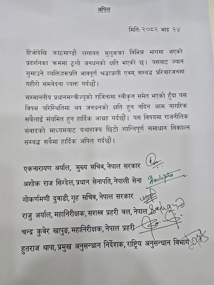 मुख्य सचिव, गृह सचिवसहित प्रधानसेनापति, सशस्त्र प्रहरी प्रमुख, नेपाल प्रहरी प्रमुख र राष्ट्रिय अनुसन्धान विभाग प्रमुखहरुले संयुक्त विज्ञप्ति निकालेर प्रधानमन्त्रीले राजीनामा दिइसकेको अवस्थामा शान्तिपूर्ण रुपमा समाधान निकाल्न आह्वान गरेका हुन् ।