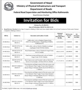 भौतिक पूर्वाधार तथा यातायात मन्त्रालय, खानेपानी मन्त्रालय र मेलम्ची खानेपानी आयोजनाका सरोकार समितिबीच मंगलबार भएको समझदारी कार्यान्वयन क्रममा सडक डिभिजन कार्यालय चरिकोटले बुधबार सडक स्तरोन्नति गर्न टेन्डर आह्वान गरेको हो ।